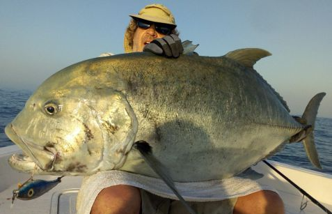 Während des Sonnenuntergang hatten wir den ersten GT-Kontakt. Im flachen Wasser vor Hallaniyat hatte Rolf einen Biss. Die Bremse zu, die Rute krumm bis ins Handteil. Yunus, der Kapitän, hatte den Drill im Blick und steuerte das Boot ins tiefere Wasser. Rolf schnaufte, wie eine Lokomotive. So ein GT-Drill fordert wirklich alles. Es gelang den Fisch ans Boot zu bringen. Gaff in den Unterkiefer, Fisch ins Boot, Haken raus, messen, wiegen, Foto machen, zurücksetzten und die ganze Zeit laut jubeln! 117cm bei 35kg (gewogen) geballte Kampfkraft! Yunus meinte, in der 30-40 kg Klasse sind GTs die härtesten Gegner. Er muss es wissen.